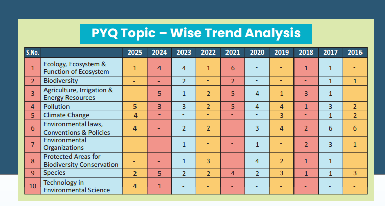 A decade-wise analysis showing how Environment consistently delivers high-weightage questions — making it a “must-master” subject for serious aspirants.